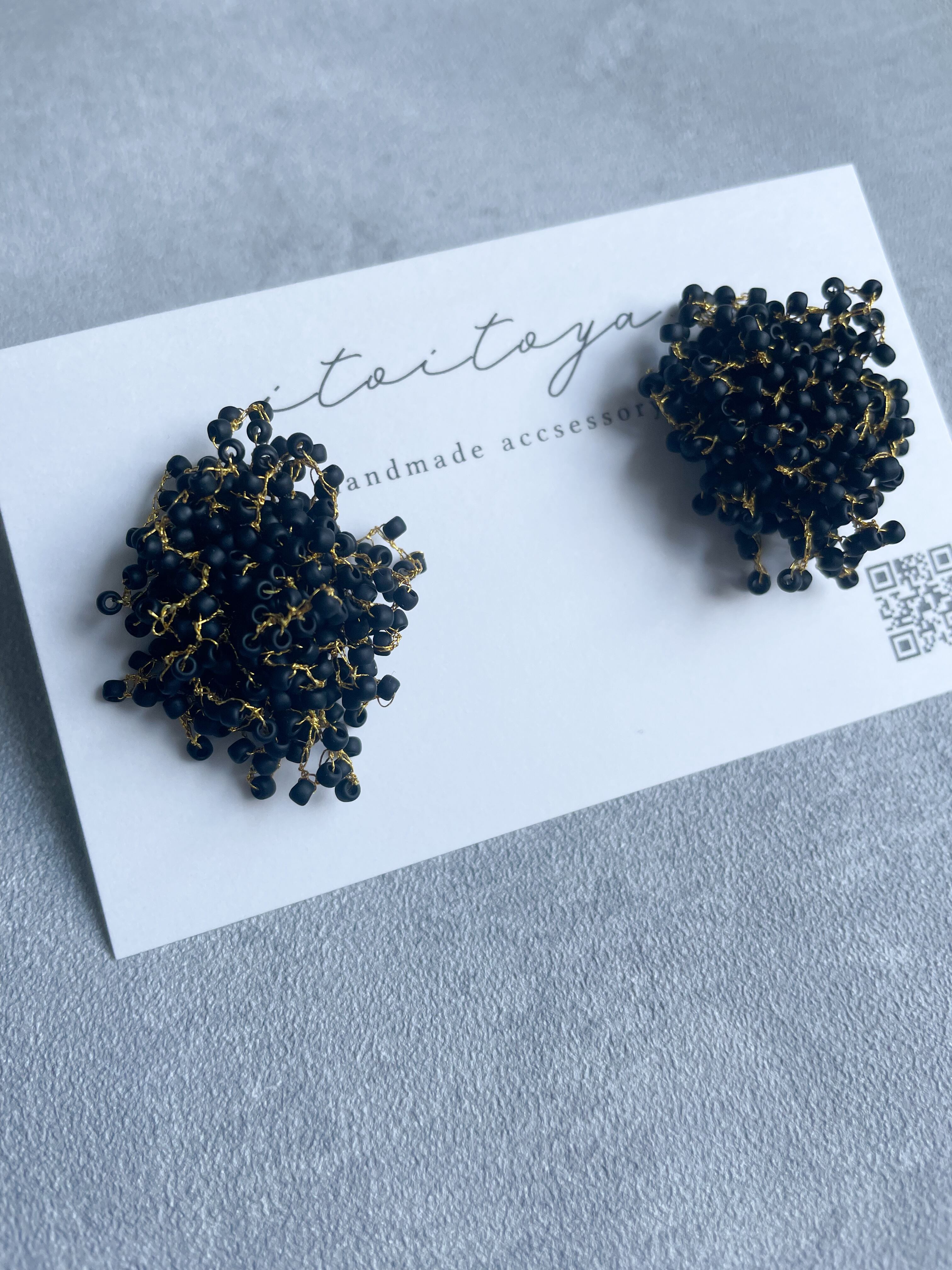 繊細さと力強さを兼ね備えたこの耳飾りは、マットブラックのビーズを細い金糸で丁寧に編み上げて制作しました。